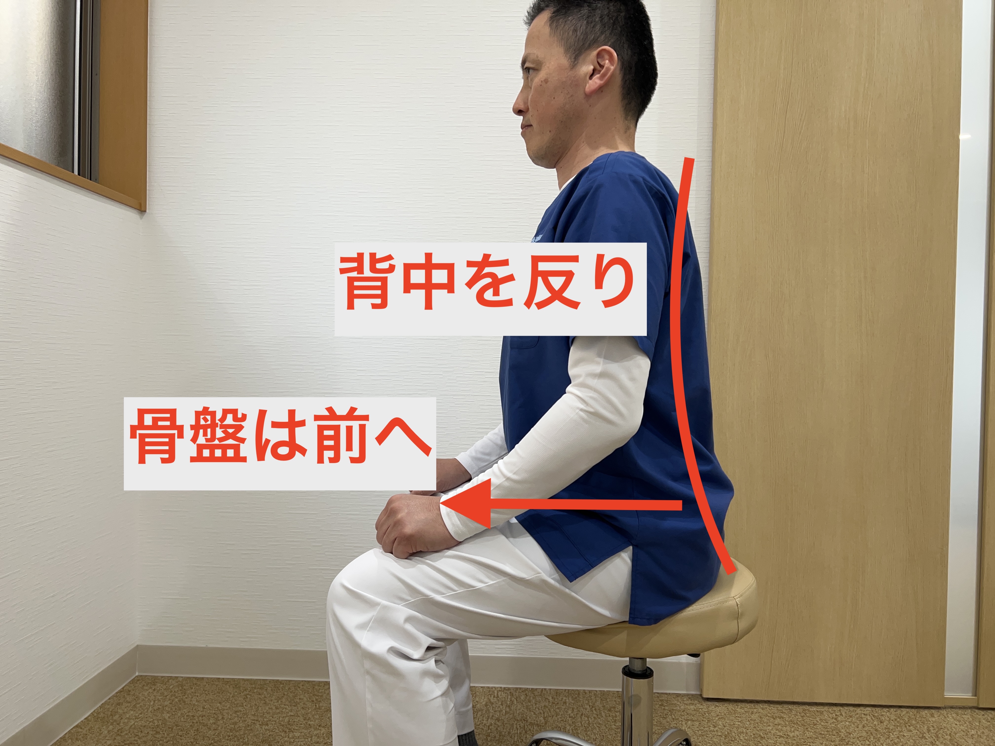 椅子に浅く座り、骨盤を前後にゆっくり10回動かします。